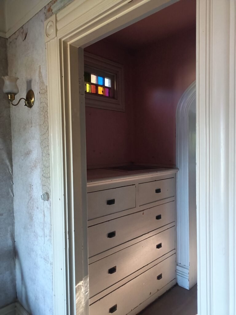 We walked through the house, once considered a mansion in its day, with spacious rooms designed for entertaining, fireplaces in nearly every bedroom, and a generous attic that once served as the nanny’s quarters and playroom for the children. The primary bedroom even boasted its own en suite bath and a small balcony overlooking the grounds — a rare luxury for the period.